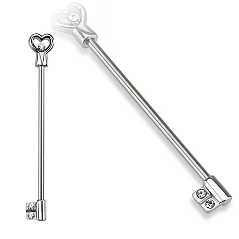 Slank, blank och elegant industriell stav (industrial) till ditt öra. Designen är otroligt söt och feminin med en stav som föreställer en nyckel med ett hjärtformat håndtag. Det sitter två små glimtande stenar nere i själva nyckeldelen samt en enkel sten inuti hjärtat. De små stenarna finns i antingen klar, rosa eller turkos - allt efter smak och behag. Alla tre stenar på din stav kommer att ha den färgen som du väljer.