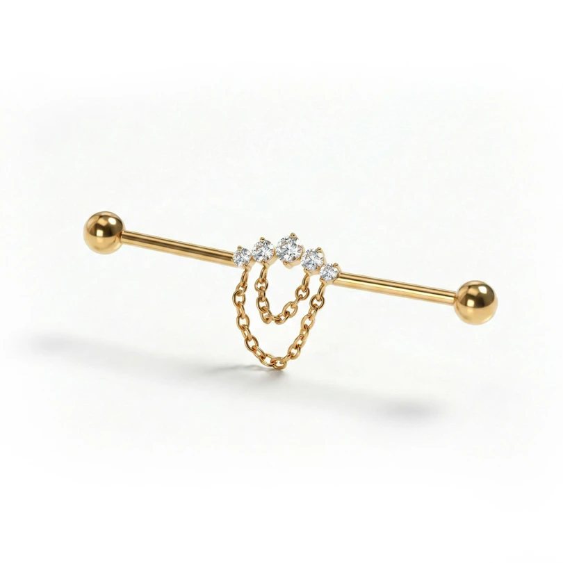 Industrial stav i titan med stenar och kedjor ger extra detaljer till den klassiska industrialformen. Små stenar är infattade längs stången och tunna kedjor binder ihop dem för en lager-på-lager-känsla som känns stilren och lättburen. Den syns utan att skrika och funkar perfekt om du gillar subtil variation i din setup. Finns i färgerna guld och silver.