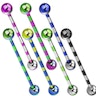 Denna modell fins i 7 olika varianter där det enda som är skillnaden är färgen. Annars är de 100% likadana i både längd, tjocklek och kulstorlek. Stavarna är gjorda av kirurgiskt stål och har sedan blivit nedsänkta i ett litet badkar med ström i, vilket har gjort att de har fått den annorlunda färgen utanpå. Hur har man kunnat gjort ränder på det sättet? tänker du säkert. Man ser bara till att isolera den delen av smycket som man inte vill ska bli färgat med t.ex. lite tejp. På så sätt blir endast staven färgad. Ett smart och snabbt sätt att ge sina smycken en annat look än bara den vanliga blanka stilen.