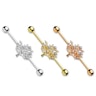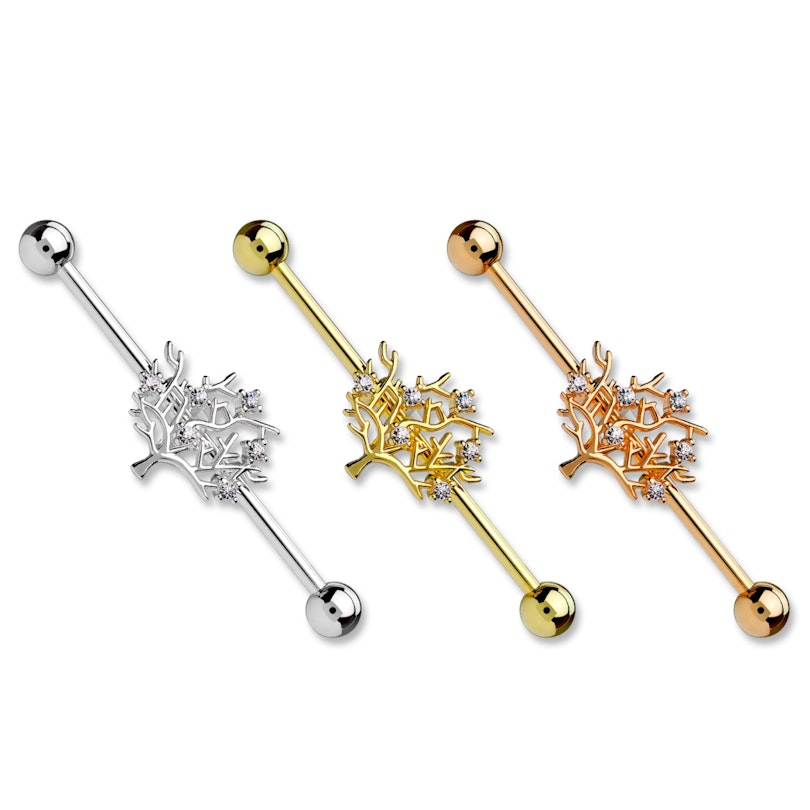 Staven är gjord av kirurgiskt stål och kan köpas i tre olika färgvarianter. Det är endast färgen som är skillnaden - formen och stenarna är likadana oavsett vilken färg du väljer. Själva trädet är gjort av mässing och har sedan färgats i samma färg som staven.