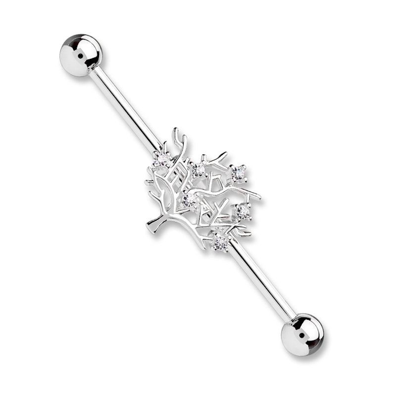 Vilket träd du ser på denna industrial stav är helt upp till dig! Trädet ser väldigt naket ut då det inte har några blad, men å andra sidan gör de små kristallklara stenarna att det ser ut som att det hänger stora, frodiga frukter från träder. Det skulle naturligtvis också kunna vara livets träd som är placerat på staven. Trädet kan röra sig fritt på den 38 mm. långa staven då det på trädets bakdel sitter två metallringar som staven går igenom. Det betyder nödvändigtvis inte att du inte kan bära trädet vart du vill. Det kan du nämligen absolut göra tack vare att det på trädets baksida sitter en liten gummirum som ser till att trädet sitter bra vart du än placerar det.