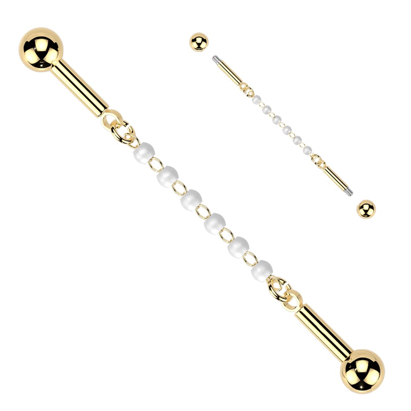 Industriell stav med pärlkedja ger en mjukare detalj till den tuffa industriellformen. En rad små pärlliknande kulor löper mellan ändarna, sammanlänkade med tunna kedjelänkar som ger baren en uppklädd känsla. Finns i guld- och silverfärg och är den du plockar fram när du vill ha något annat än en vanlig rak stång.