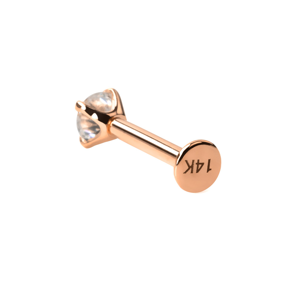 Smycket här är gjort av 14 karat guld och finns i tre varianter, vilka är gult guld, rödguld och vittguld. Mängden av guldinnehållet är lika oavsett vilken variant du väljer. När du väljer materialet väljer du samtidigt hur lång du önskar din labret ska vara samt hur stor stenen på framsidan ska vara. Har du tur att ha tre öronpiercingar i exempelvis en helix kan du med fördel köpa tre olika stenstorlekar, så de sitter på en rad och blir större sten för sten.