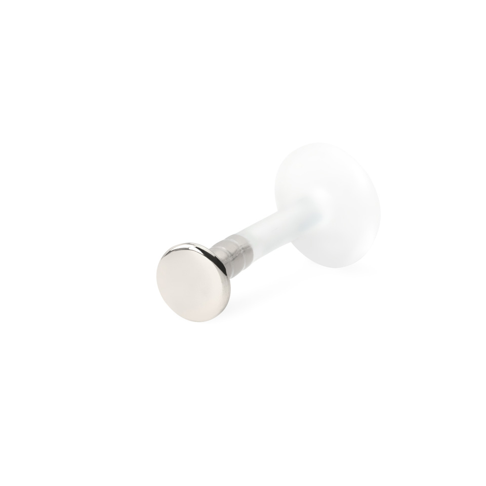 Den här labret har en push-in stud som trycks in i PTFE-staven för att stänga den. PTFE är ett lätt och flexibelt material, mycket användarvänligt, eftersom du knappt märker att du bär det. Dessutom är det nickelfritt, så det är helt säkert för allergiska personer.