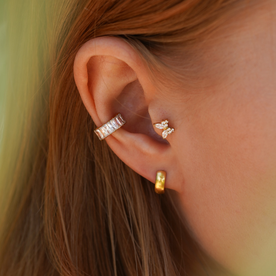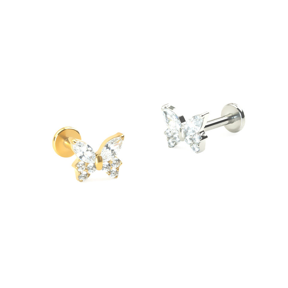 Denna vackra labret består av 8 glittrande CZ-stenar - varje vinge har en marquise-slipad sten, som formar toppen av vingen, och tre små runda stenar som formar botten av vingen. Fjärilen är precis under 7 mm som bredast och 5,5 mm lång, så det är en perfekt storlek för olika öronpiercingar.