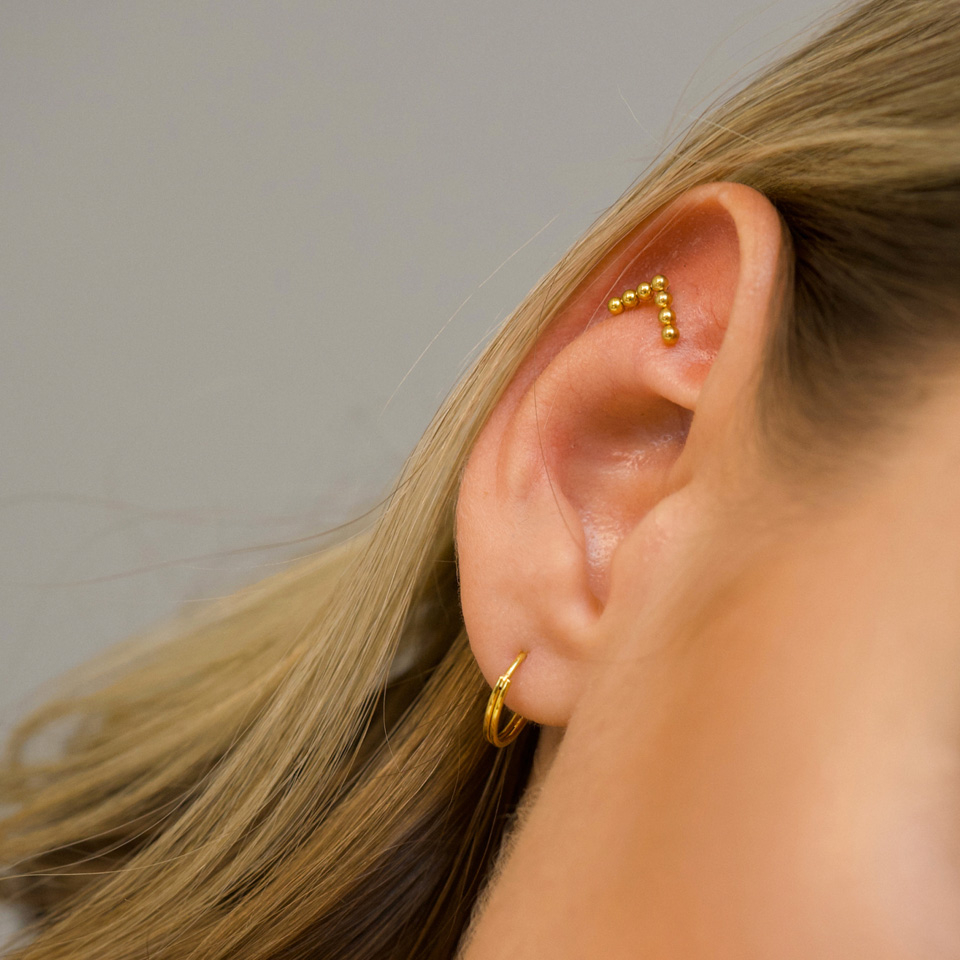 Staven har standardlängden på 8 mm och finns tillgänglig i trådtjocklekarna 1 och 1,2 mm, vilket gör att den passar piercingar såsom helix och örsnibben.