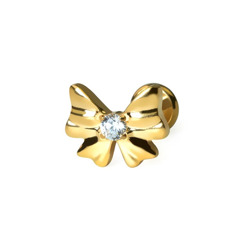 Denna gulliga labret har en söt rosett och en CZ-sten i mitten. Rosetten är 8 mm som bredast, medan stenen mäter 2 mm i diameter.