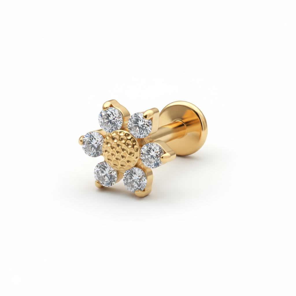 Denna labret i titan med tusensköna är en liten påminnelse om att alla dagar inte behöver vara så seriösa. Med en blomdesign gjord av klofattade stenar och en mitt av strukturerad yta, tillgänglig i färgerna guld eller silver, för den med sig den rätta touchen av lekfull charm.