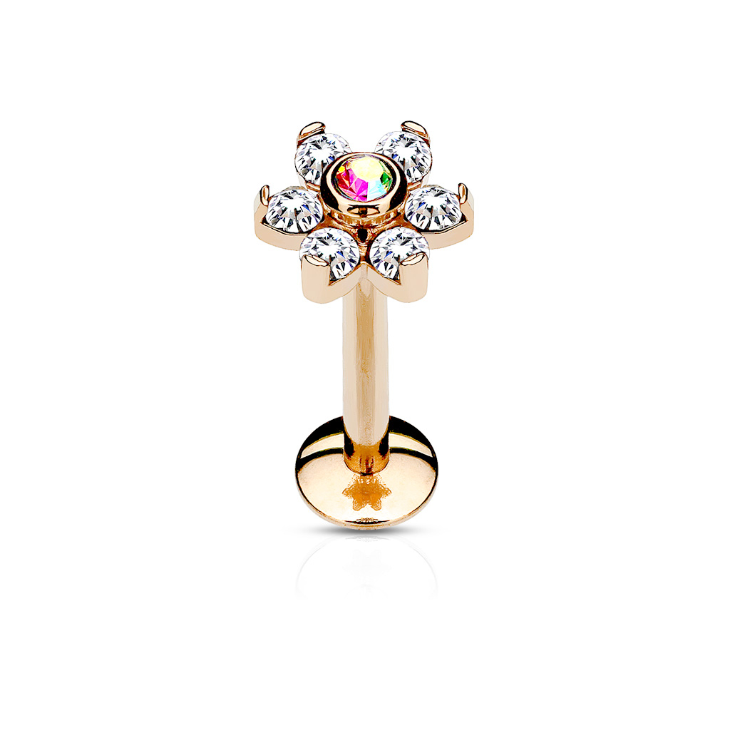 Labret med blomma och invändig gänga-Roséguld-Aurora Borealis