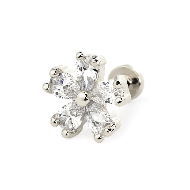 Som du kan höra av namnet så är denna labret dekorerad med en vacker fembladig blomma. Bladen på blomman är faktiskt gjorda av sten. Det vill säga att blomman tar form med hjälp av de fem droppformade klara stenarna som sitter och glimrar på toppen av detta smycke.