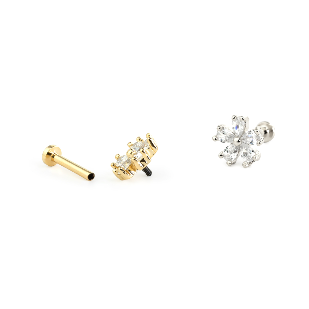 Blomman är gjord av mässing och belagd för att matcha resten av labretten. Du kan nämligen få smycket i flera olika färger därför är blomman belagd allt efter vilken färg du väljer till smycket. Väljer du exempelvis en rödguld labrett - ja då är blomman också rödguld. Stenarna kommer dock alltid vara klara.