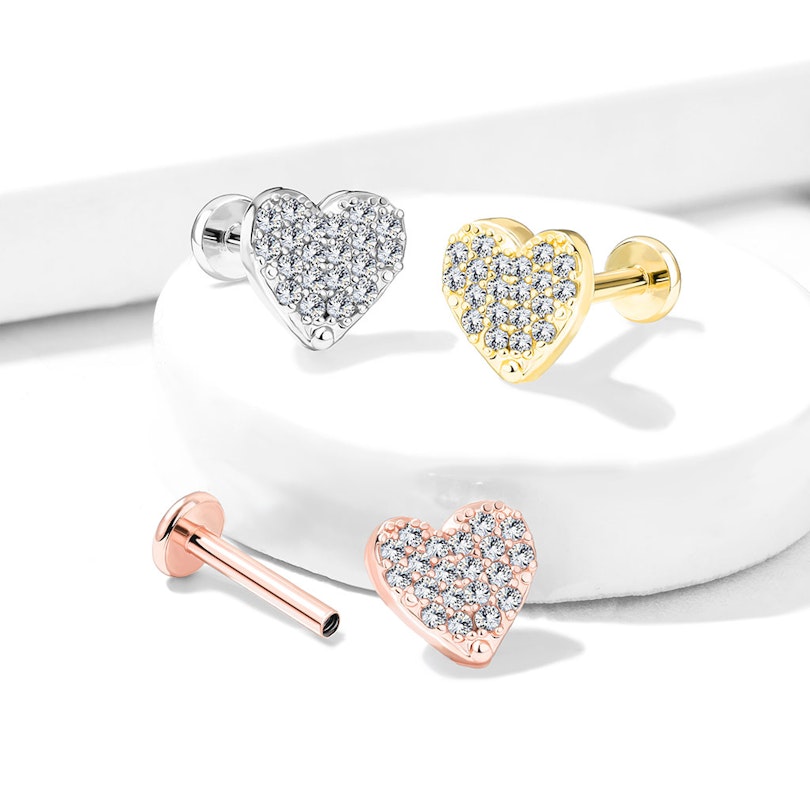 Hjärtdesign på piercingar är otroligt populärt. Här kommer det en till - denna gång med en liten twist. Smycket du har klickat in på är en labret med ett sött hjärta på toppen. Hjärtat har blivit dekorerad med flera små klara stenar som får hjärtat att glittra och glimra.