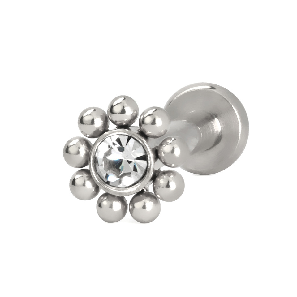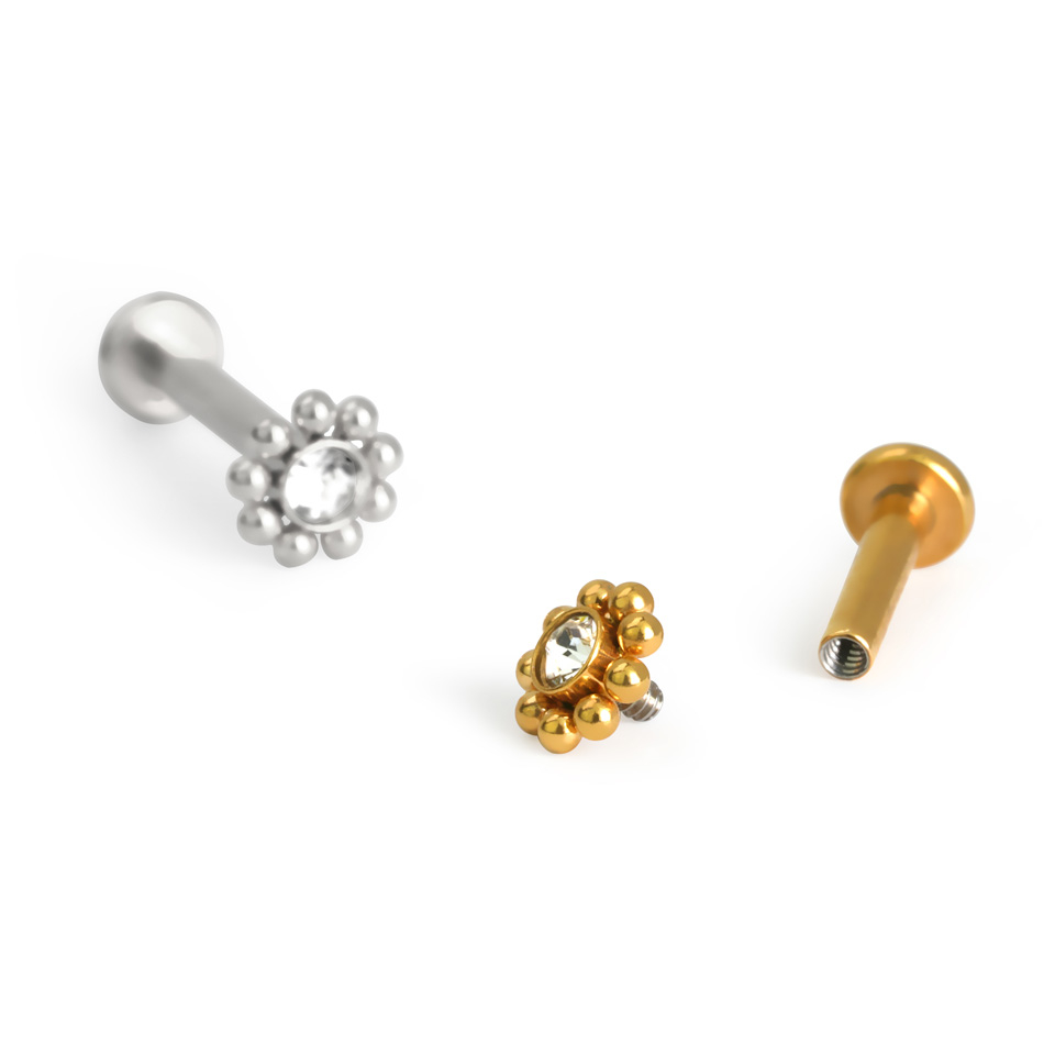 Labretten finns i två olika längder och fyra olika färger. Alla varianter är gjorda av kirurgiskt stål och färgade med en process kallad PVD, en mer hållbar färg än vanlig beläggning. Smycket har en klar sten på framsidan och en invändiga tråd som skruvas ner i staven. Att tråden är intern är en stor fördel för dig. En utvändig tråd ger lätt rivsår inne i din piercing, vilket inte sker med en invändig.