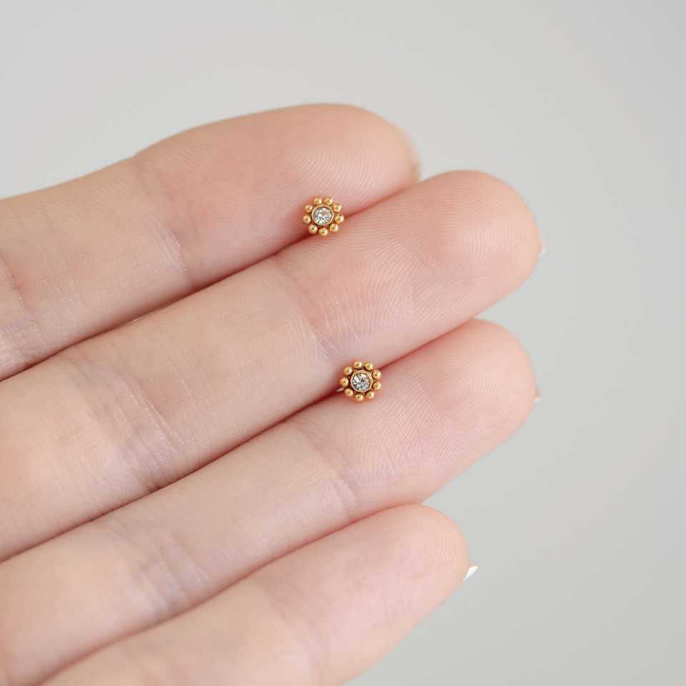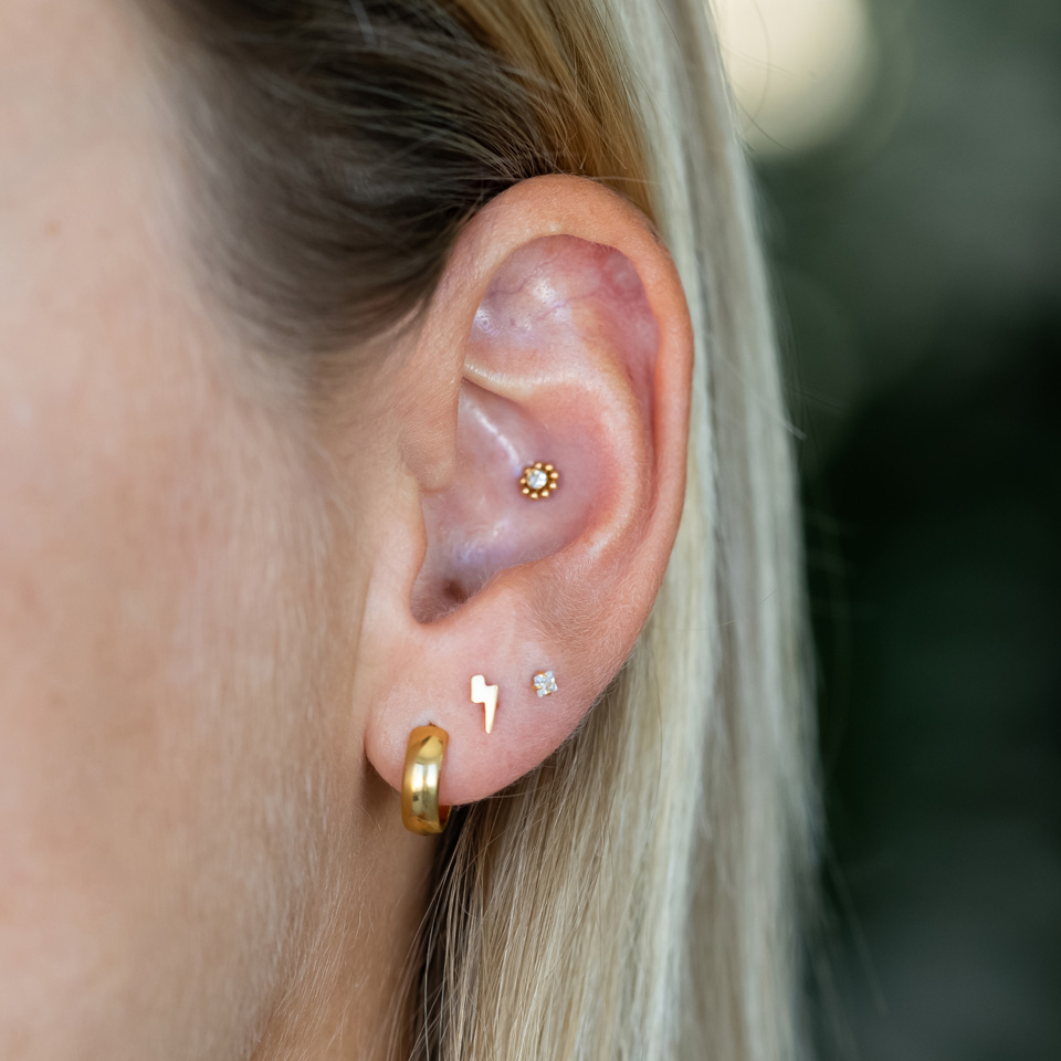 Den här vackra labreten bär jag som ett komplement till min boll-clicker. Jag tycker motivet ser ut som en sol. De små kulorna omger zirkoniakristallen som strålar. Underbart. Eftersom jag bär silver- och guldaccessoarer har jag unnat mig både guld- och silvervarianten. Jag har dock en önskan till bodymod-teamet: dessa skatter av titan! Men även dessa i kirurgiskt stål är väl tolererade. Med det i åtanke: Ha solen i hjärtat och skaffa dig dessa underbara bitar!