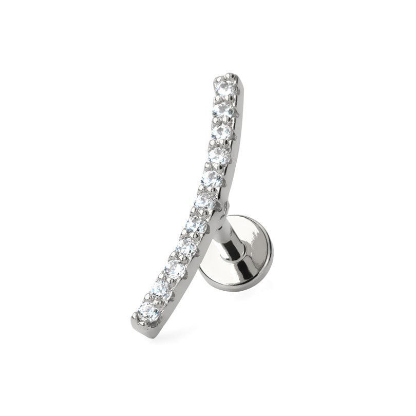 Det här måste vara en av de lite mer iögonfallande labretter. Det är iallafall svårt att inte lägga märka till detta smycke med den långa stendekorerade bågen.