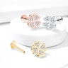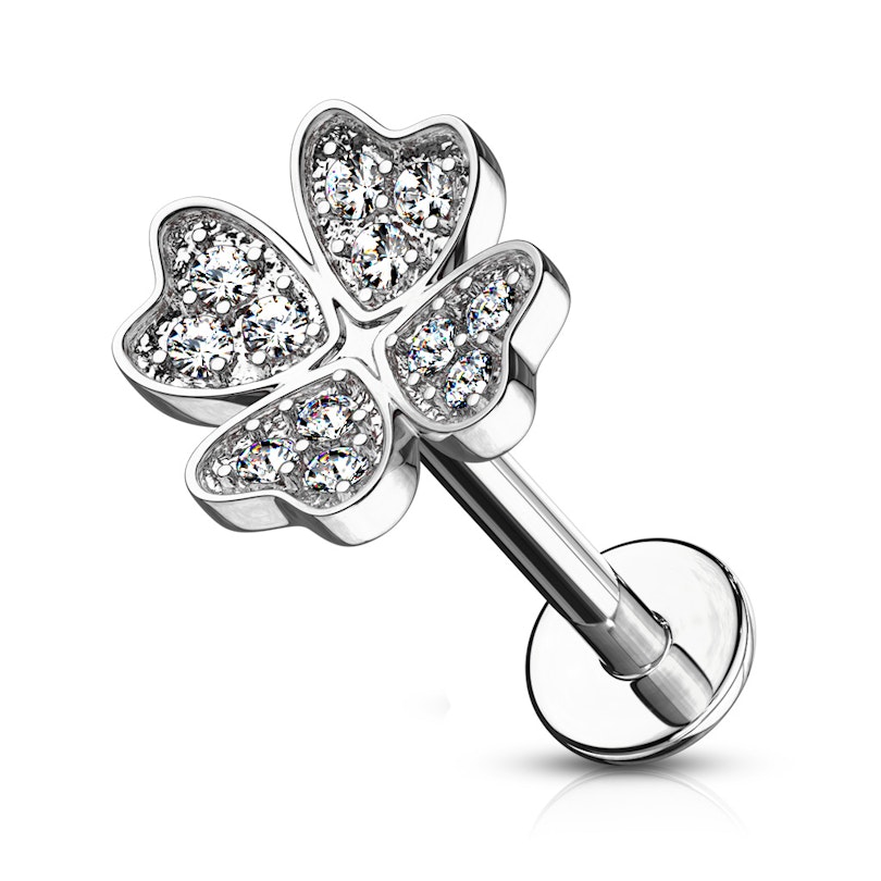 Labretten är utrustad med en invändig tråd vilket betyder att fyrklövern skruvas ner i staven. Labretten är gjord av kirurgiskt stål och har också blivit belagd. Du kan därför välja mellan flera färger till detta smycke , bland annat blank och guld. Utöver det kan du också välja mellan flera längder på labretten. Smycket finns tillgängligt i bland annat en längd på 6 mm.