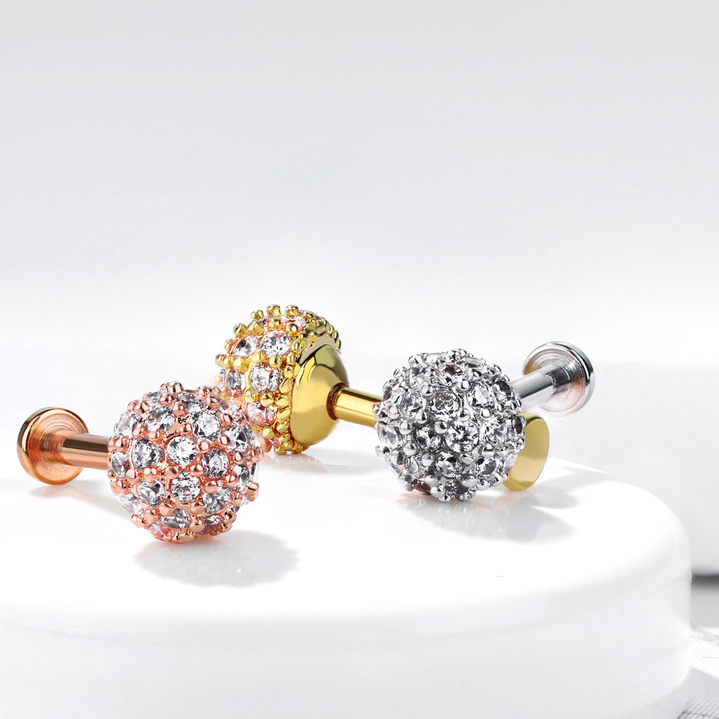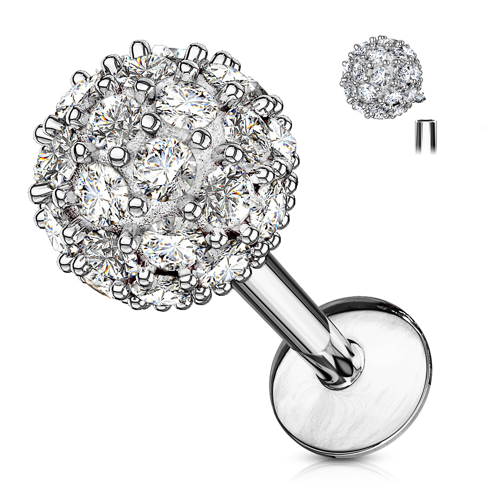 Smycket här är nämligen dekorerad med en stor kula på hela 6 mm i diameter. Runt om hela kulan sitter det små klara stenar som glimtar så fort ljuset träffar dem - därmed kommer denna labret även dra till sig en del uppmärksamhet, om det är det man önskar. Staven på smycket är gjort av kirurgiskt stål och kulan är gjort av mässing. Kulan har också blivit belagt med olika färger för att ge dig möjligheten att välja mellan flera färger. Väljer du exempelvis en guld variant av smycket så är den belagd med 14 karat guld.
