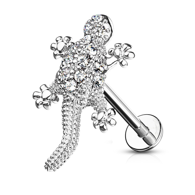Labretten här är gjord av kirurgiskt stål och den söta lilla ödlan som sitter på toppen är gjord av mässing. Hela härligheten har blivit belagd för att ge dig möjligheten att välja mellan flera färger på smycket. Det kan vara utgåvan rödguld som lockar dig mest, eller att guld utgåvan faller dig i smaken. Ovan på ödlan sitter det flera små klara stenar som ger den redan vackra ödlan lite extra bling - dessa stenar kommer alltid vara klara oavsett färgen du väljer till smycket.