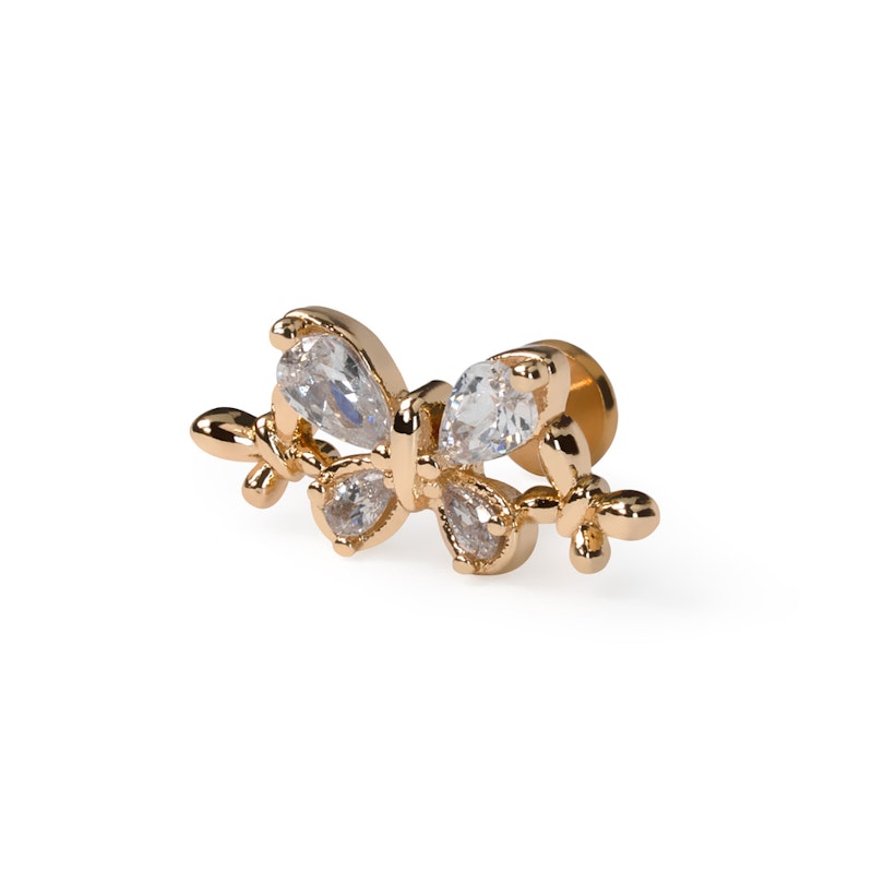 Denna labret med tre fjärilar handlar helt och hållet om lekfulla detaljer. I mitten sitter en stor fjäril av klofattade klara stenar, medan två mindre fjärilar i goldton vilar på vardera sida om den större, vilket skapar en fin trio full av karaktär.