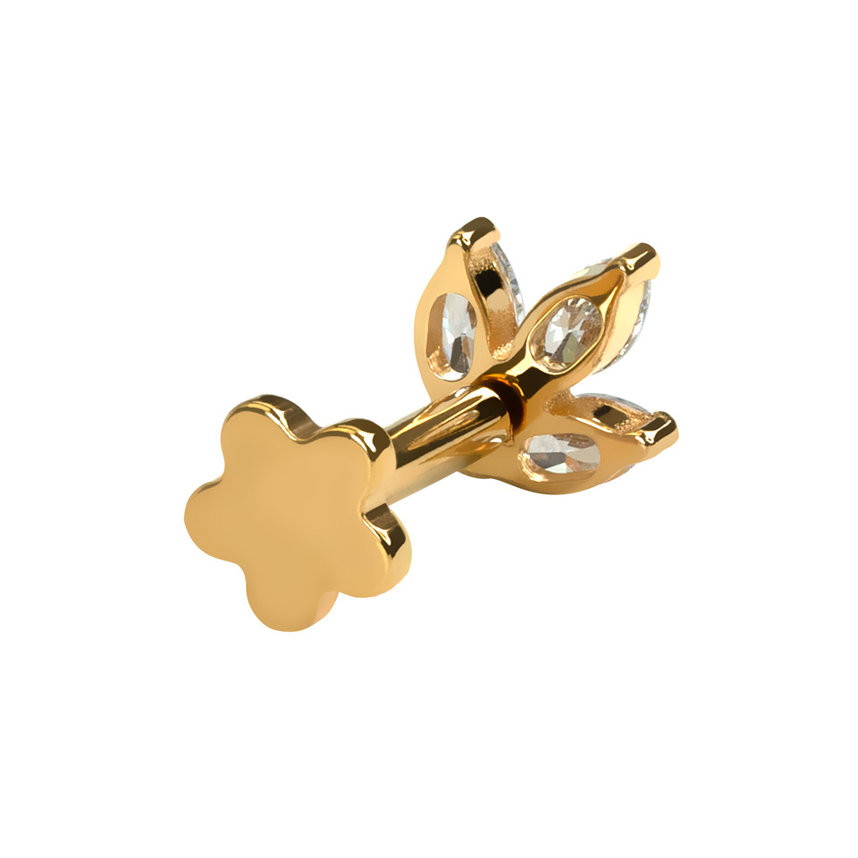 Dubbelsidig labret med en lövdesign på framsidan med tre marquise-slipade CZ-stenar, och en platt baksida i form av en blomma. Perfekt att ha i piercingar där även baksidan av smycket är synligt.
