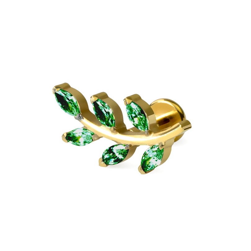 Vacker premium-labret formad som ett löv, tillsammans med 6 läckra marquise-slipade stenar. Tillgänglig med stenfärgerna grönt eller klassiskt klara, med smycket i färgerna guld eller silver. Ett smycke som blir ett stilfullt tillägg till din rad av öronpiercingar.