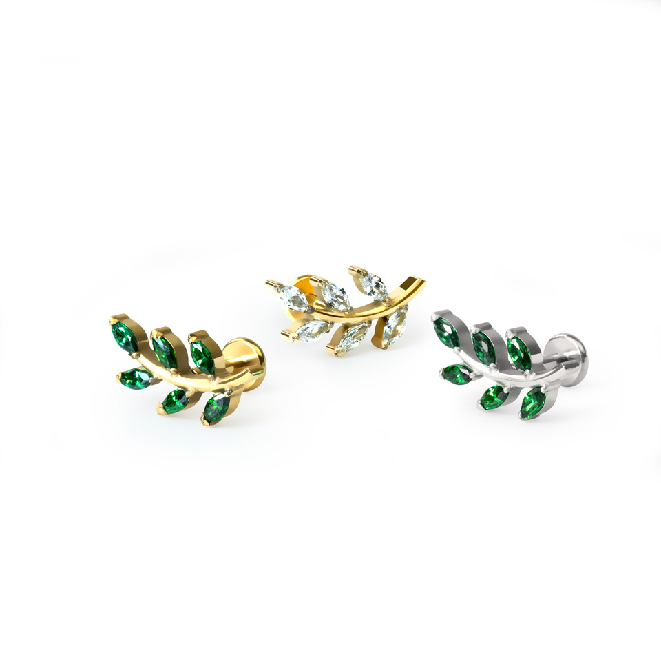 Vacker premium-labret formad som ett löv, tillsammans med 6 läckra marquise-slipade stenar. Tillgänglig med stenfärgerna grönt eller klassiskt klara, med smycket i färgerna guld eller silver. Ett smycke som blir ett stilfullt tillägg till din rad av öronpiercingar.