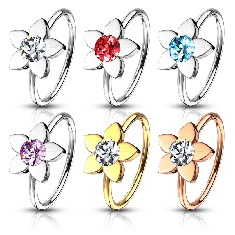 Smycket som du har klickat dig in på är en näsring med en lotusblomma fäst på framsidan av smycket. Inne i lotusblomman sitter det en rund sten, som du själv kan välja färg på. Du kan som exempel få smycket med en rosa eller röd sten. På toppen av det kan du också välja färg på själva smycket – välj bland annat mellan en guld och en blank variant av smycket. Därmed kan du helt själv sätta samman din bästa utgåva av smycket. Vi noterar dock att varianterna av guld och rosaguld endast är dekorerat med en klar sten.