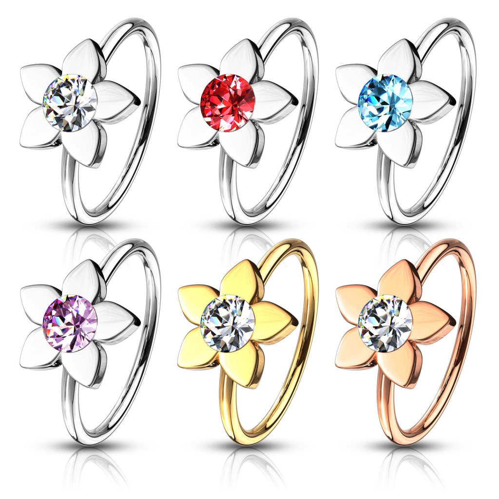 Smycket som du har klickat dig in på är en näsring med en lotusblomma fäst på framsidan av smycket. Inne i lotusblomman sitter det en rund sten, som du själv kan välja färg på. Du kan som exempel få smycket med en rosa eller röd sten. På toppen av det kan du också välja färg på själva smycket – välj bland annat mellan en guld och en blank variant av smycket. Därmed kan du helt själv sätta samman din bästa utgåva av smycket. Vi noterar dock att varianterna av guld och rosaguld endast är dekorerat med en klar sten.