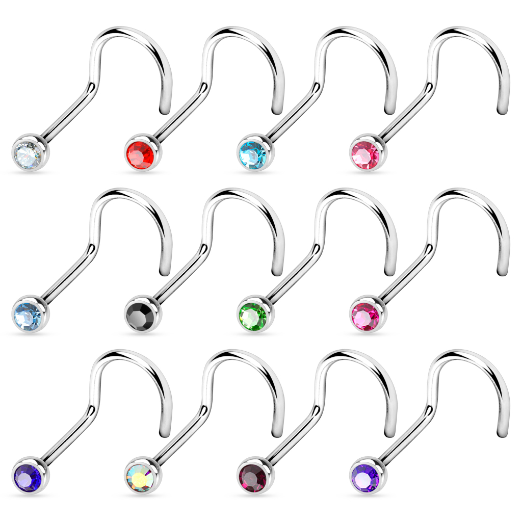 Denna nässkruv är gjord av det bästa materialet som finns: grad 23 titan. Titan är det säkraste materialet, passar alla även de som har nickelallergi. Du kan även bära denna titan nässkruv i en ny näspiercing eller tragus piercing. Denna nässkruv finns med stenar i olika färger.