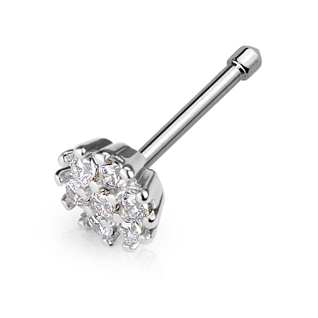 Den här nässtaven är för dig som gillar den feminina looken, men samtidigt inte vill ha något som inte syns. Det här smycket är lite större än andra smycken och mäter faktiskt 6 mm. i diameter. Men istället är det fyllt med små klara stenar som föreställer blomblad. Det kan dock vara svårt att skilja mellan stenarna och resten av blomman då det spegelblanka materialet och de kristallklara stenarna smälter in i varandra. Men det är just det som gör smycket feminint.
