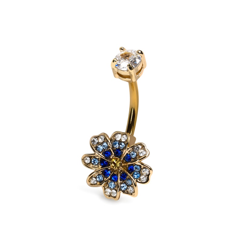 Denna gulliga navelbarbell är gjord för magtröjesäsongen. Den har en blomma gjord av små stenar i olika nyanser av blått med en central gul sten. Toppkulan har en klar sten.
