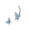 Denna navelbarbell har inte bara en, utan två gulliga blåa fjärilar - en stor skönhet i bottenkulan och en nätt tvilling i toppkulan. Båda har små glittriga stenar på vingar och kropp.