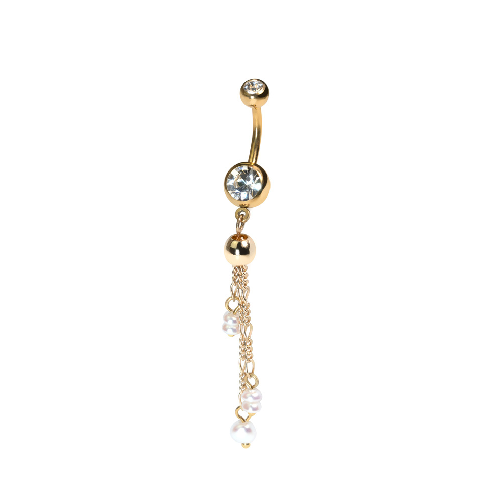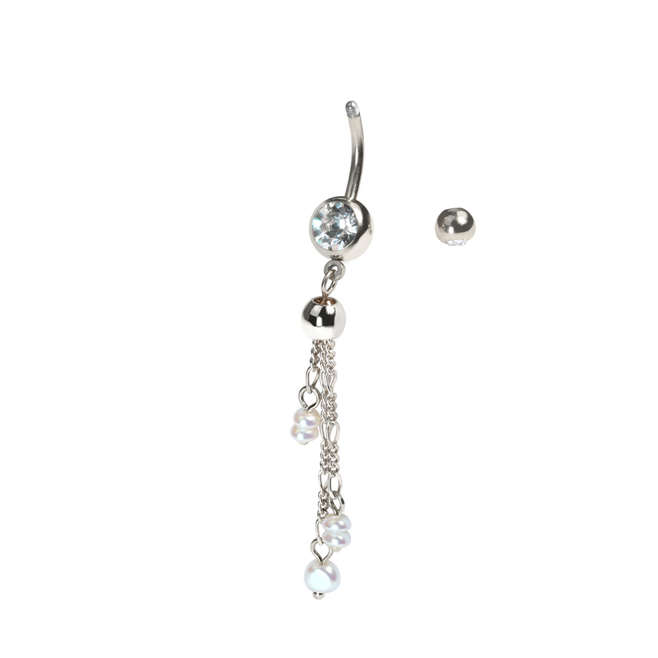 Denna navelbarbell med kedjor och pärlor pryds av bezelfattade kubisk zirkoniastenar i båda kulorna och från den nedre kulan hänger nätta kedjor med syntetiska pärlor i olika storlekar.