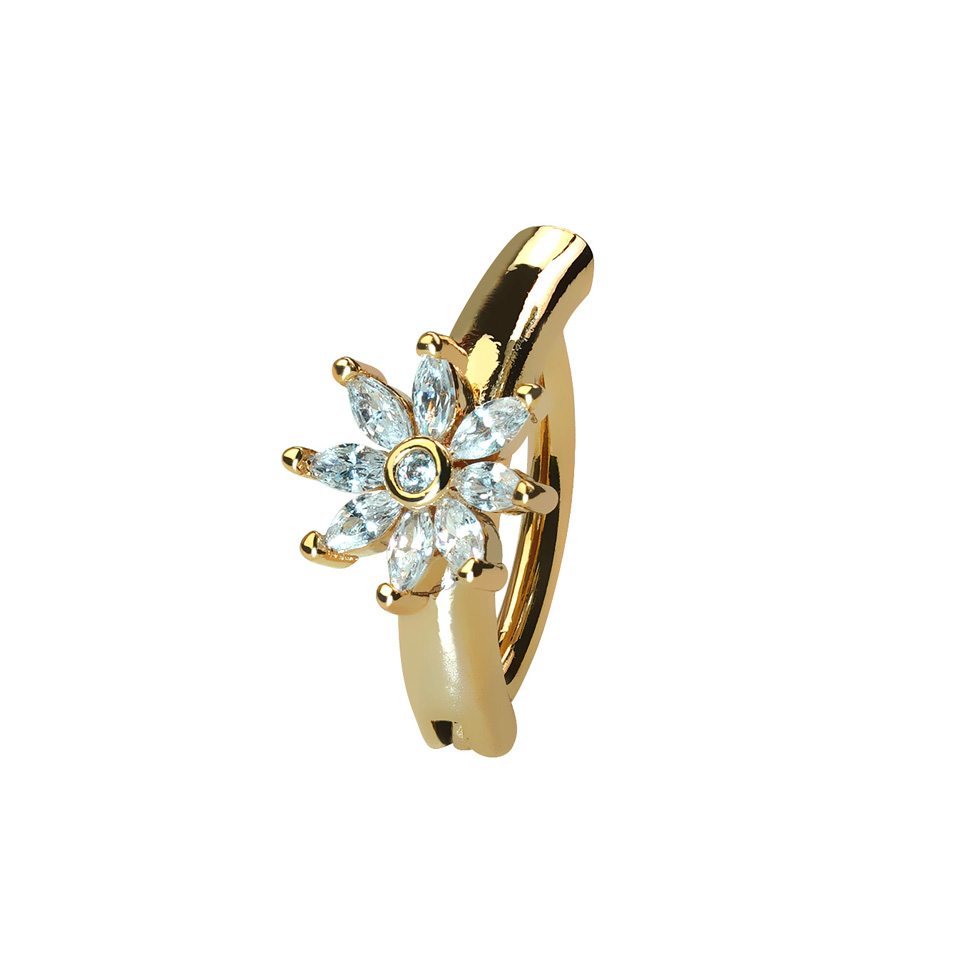 Denna eleganta navelclicker pryds av en glittrig blomma i mitten. Blomman består av 9 kubisk zirkona stenar. Smycket är tillgängligt i färgerna guld eller silver.