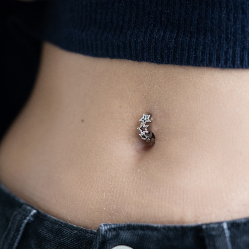 Denna navelclicker med stjärnor blir ett perfekt tillägg till din samling av navelsmycken. Gångjärnslåset gör den enkel att sätta in och säkra i din piercing.