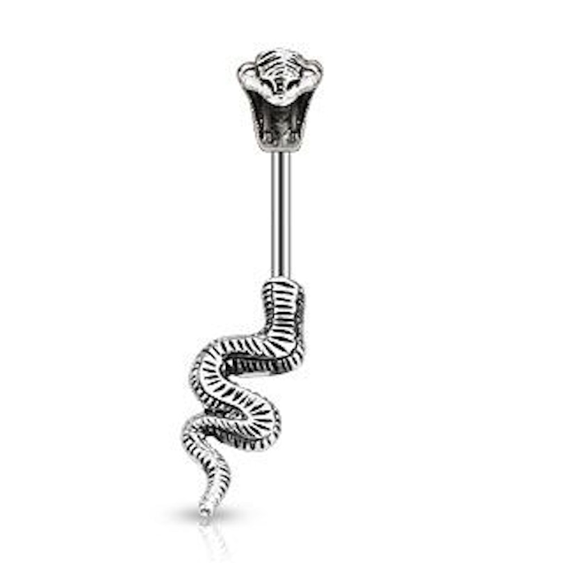 Är du också mer till de lite fräcka och kaxiga navelpiercingar som inte skriker mycket av rosa prinsessor? Kolla då in denna superhäftiga navelpiercing med en kobraorm. Den snygga kobran är väldetaljerat designat med det ifalllende huvud enkel böjd över, samt med de karaktärisiska breda kanterna ned längst sidan av huvudet. Huvudet sitter över naveln i den ena änden av staven, medan den böjda ormen sitter i den andra änden av staven, under naveln.