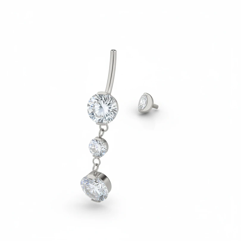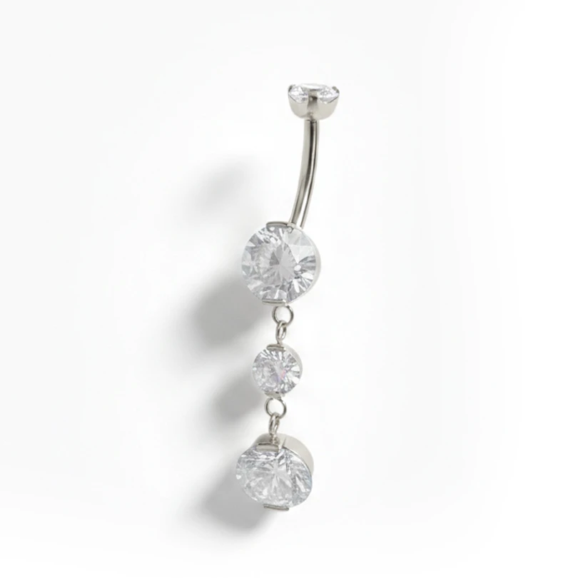 Denna vackra navelpiercing i titan med hänge har 4 bezelfattade stenar, en i varje kula och två på hänget. Den totala längden av den nedre delen av smycket - från toppen av bottenkulan till längst ner på hänget är det lite över 3 cm. Smycket stängs med invändig gänga, vilket betyder att endast den enkla staven ska igenom din piercing och sedan skruvas toppen på för att låsa den. Titan är både allergivänligt och vattentätt, vilket betyder att smycket är perfekt för dagar vid poolen.