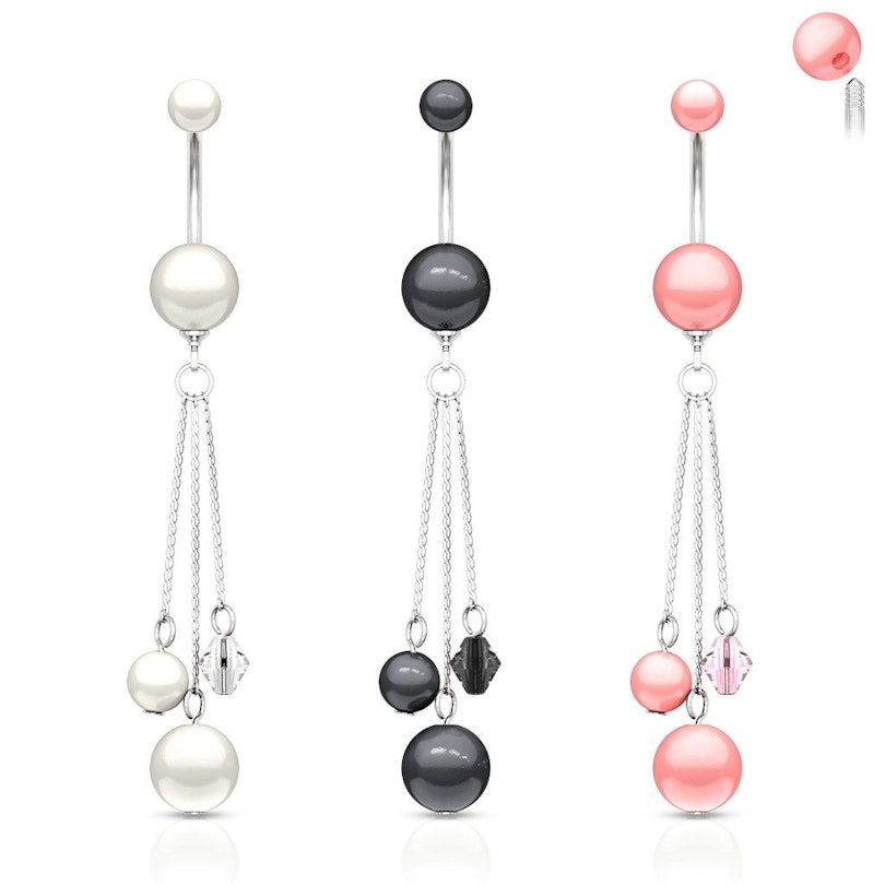 Söt navelpiercing av kirurgiskt stål med akrylpärlor. Denna navelpiercing är en riktigt söt klassiker med sitt långa kedjehänge och akrylpärlor. Topp- och bindkulor matchar kulorna som hänger nederst i de tre kedjorna i hänget, både i färg och stil. Hängena är asymmetriskt gjorda så att de inte har samma längd. Kulorna vid slutet av kedjorna är också olika på så sätt att det är en vanlig rund kula, en lite mindre rund kula samt en liten diamantformad kula. Alla tre i samma färg som topp- och bindkulan i smycket, självklart beroende på vilken av de tre sköna färgerna som du väljer.