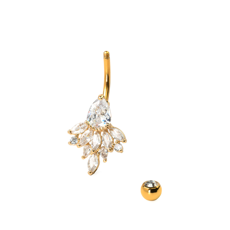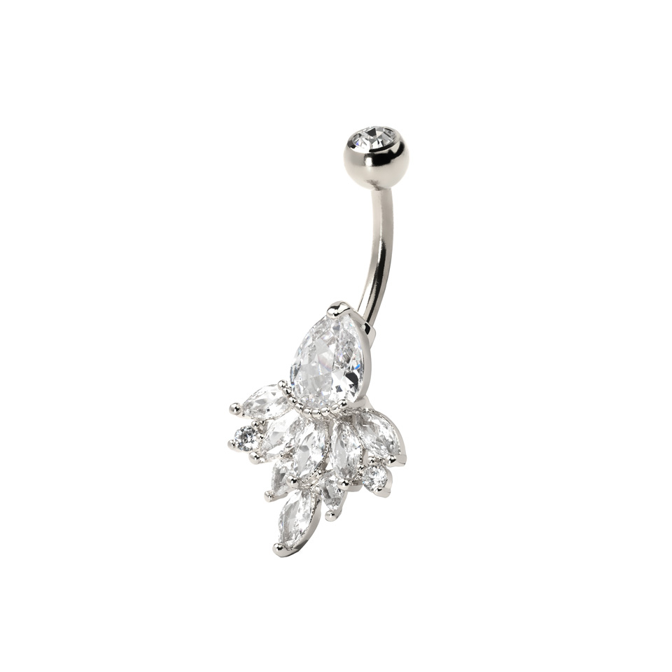 Den här navelpiercingen ser vid första ögonkastet ut precis som vanligt. En böjd stav på ca. 10 mm. och en toppkula med en klar sten. Men om man kikar lite närmare på smycket så ser man att den välkända bottenkulan har bytts ut mot en droppfärgad sten. Under den här droppen är det sedan en hel klunga av flera stenar som också är droppformade i avlång design. Dessa har blivit vad man kallar för "Marquise"-slipade. Under droppstenen sitter det fem Marquise-slipade stenar och under dessa sitter 4 droppformade stenar till - en mellan varje avlång sten. Det extravaganta smycket avslutas till sist med en avlång sten i bottnen.