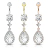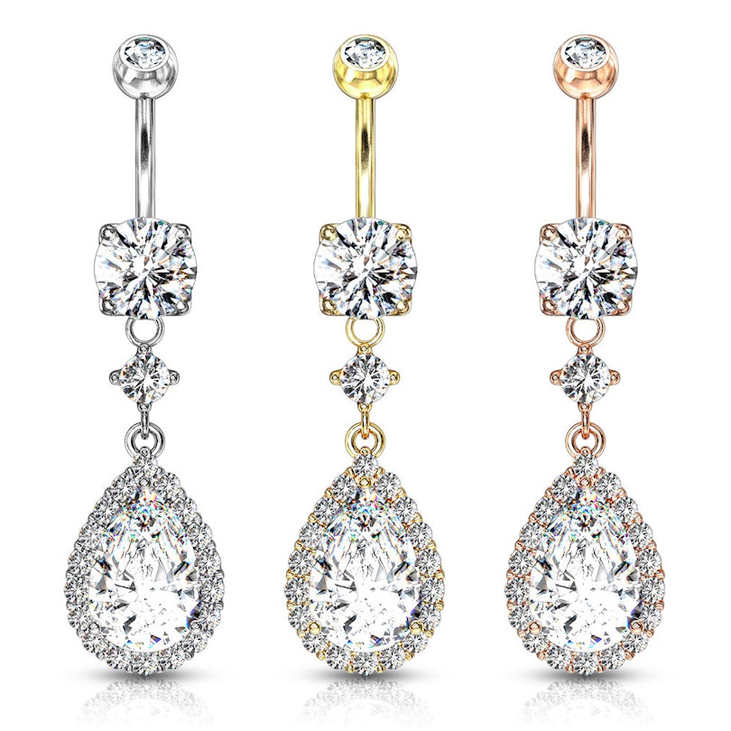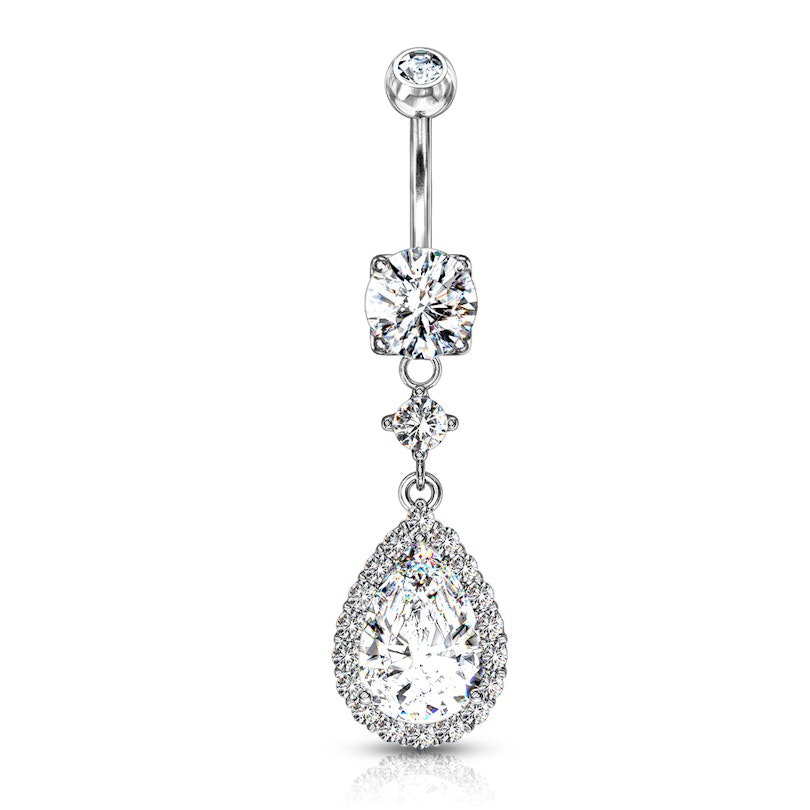 Navelpiercingen är dekorerad med en stor droppformad sten i hänge. Stenen har runt omkring sig ännu mer små klara stenar som sitter som en glimrande kant hela vägen runt. Över droppen är ännu en liten sten som samtidigt fungerar som en länk mellan bottenkulan och droppen.