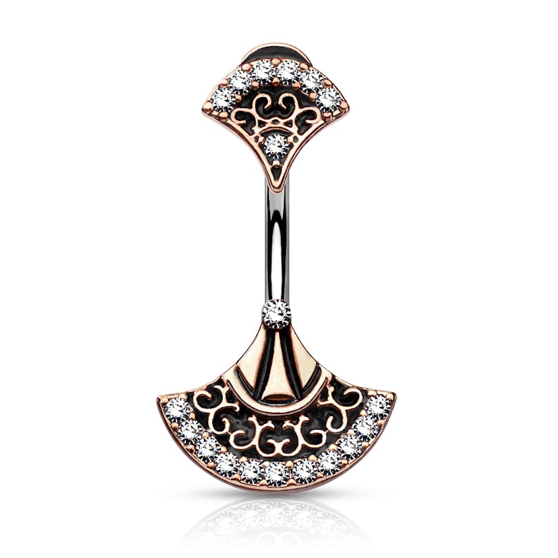 Här ser du en mycket elegant smycke till naveln. Den har lite av allt, små söta detaljer, sten och inte minst symmetri. Helhetsintrycket blir med sina flera små klara stenar mycket elegant. Stenarna sitter på varje sida av den 10 mm långa böjda staven. I toppen sitter en liten solfjäder med 7 stenar och i botten sitter en större solfjäder med hela 12 stenar.
