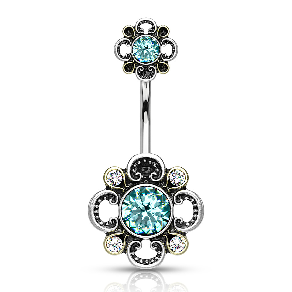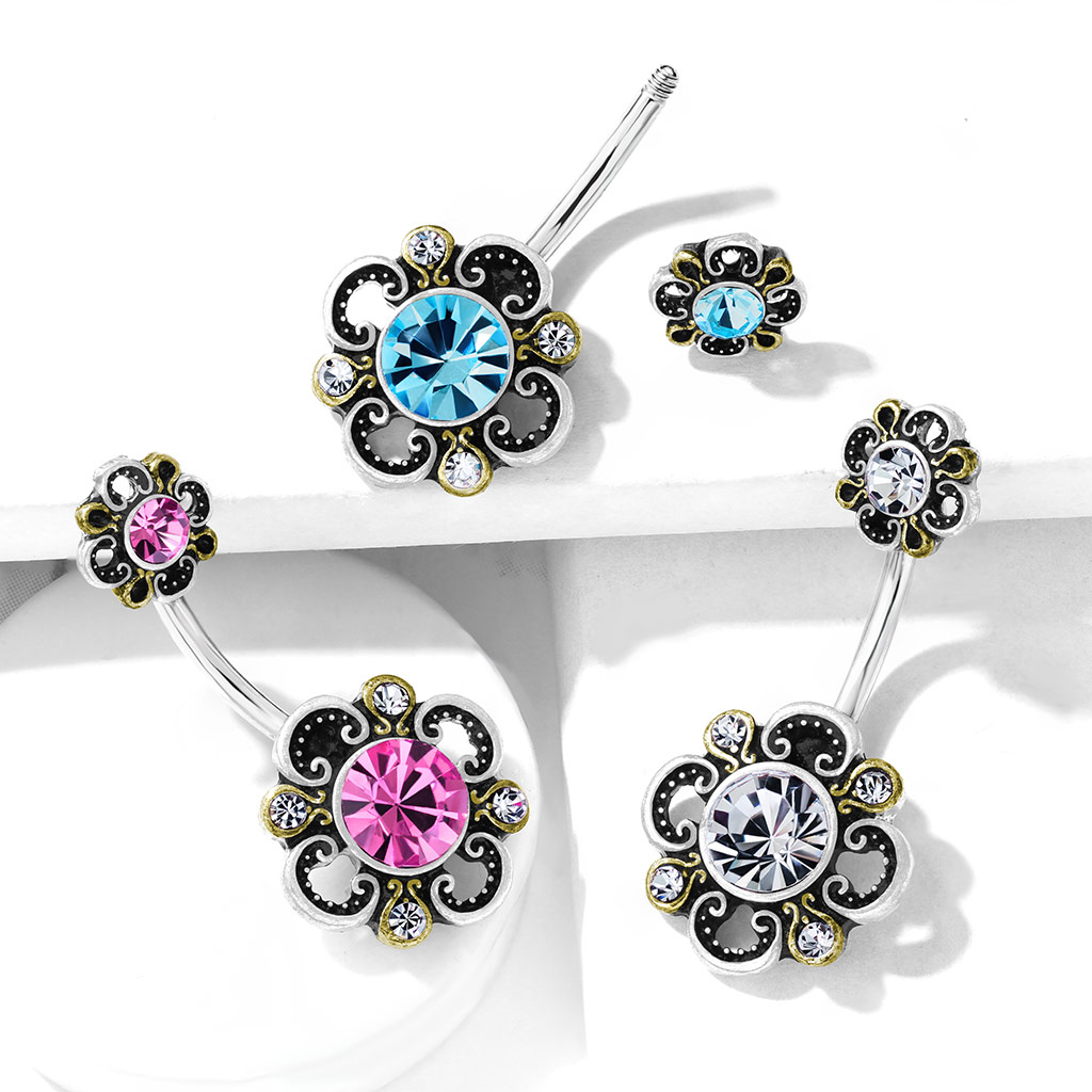 Namn: Navelring med filigranblomma med stansade blad och sten