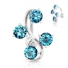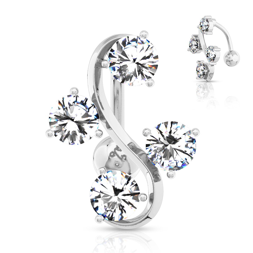 Frisk och finurlig navelpiercing med fyra runda stenar som sitter förskjutna runt omkring på ett stor "S" for. Det ser riktigt snyggt ut eftersom det ger luft mellan stenarna där huden kan se. Materialet är av kirurgiskt stål som är ett av de mest använda piercingsmyckematerialen då det inte frisätter nickel och dessutom är ett otroligt hårt material.