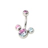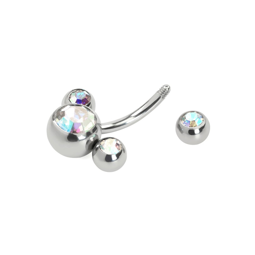 Den här navelringen har en form som alla känner till, i slutet av en böjd barbell på 10 mm (3/8") och en övre och nedre kula. Skillnaden är att denna barbell har två kulor som är anslutna till den nedre kulan. Dessutom har varje kula en färgad sten, i vackra färger som du kan välja mellan.