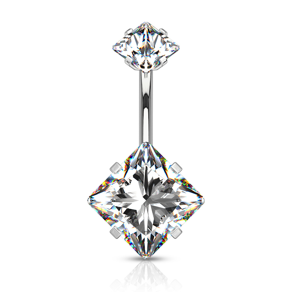 Fyrkantig sten som skiner lika mycket som stjärnorna på himlen - det är vad som sitter på denna navelring. Du kan även själv välja vilken färg den ska ha. Stenen som sitter i toppkulan mäter 5 mm och stenen i bindkulan mäter 8 mm.