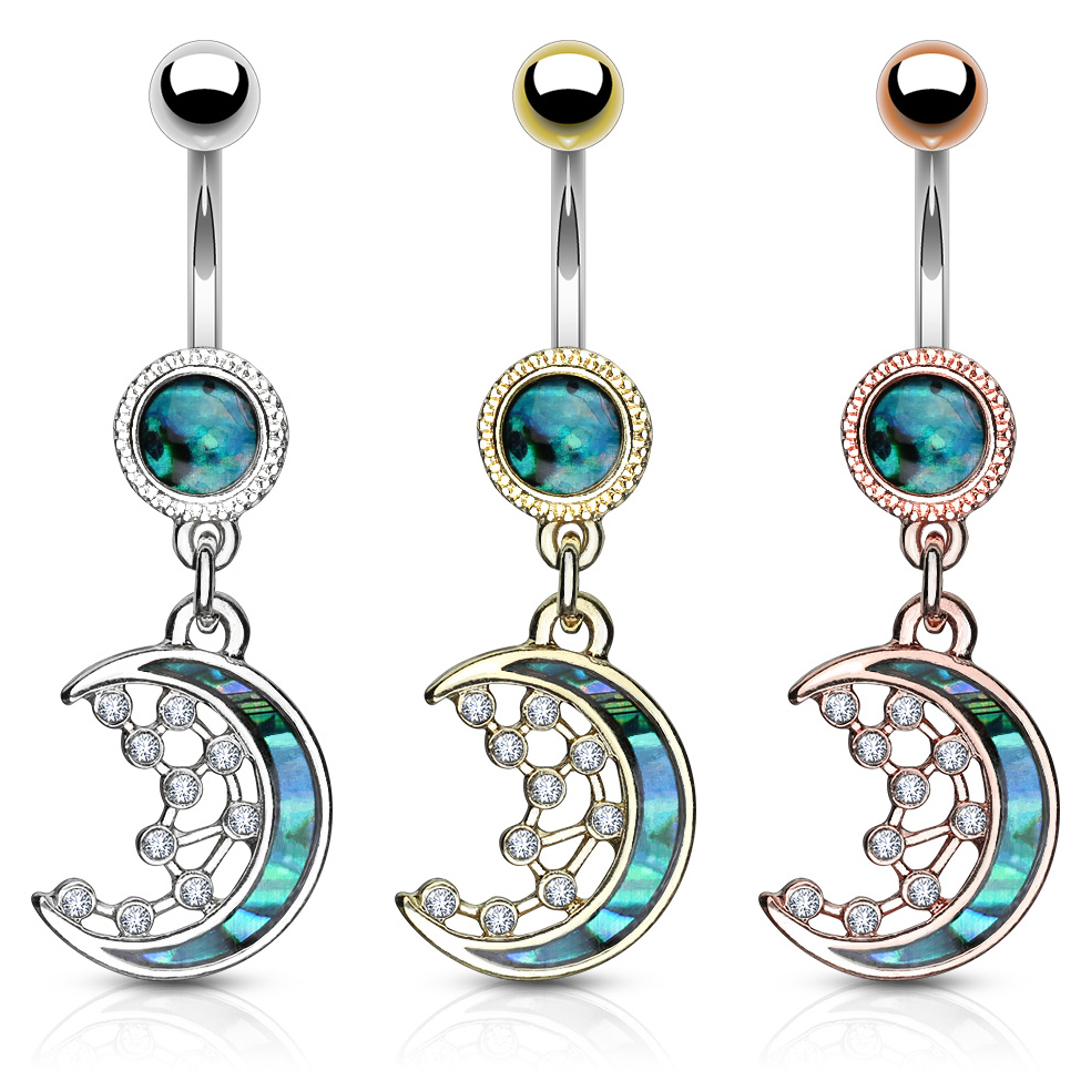 På bilden ovanför ser du en av de lite mer mystiska navelpiercingarna. Smycket är fylld med betydande symbolik från olika religioner runt omkring i världen. På smycket hänger det en halvmåne med några stjärnor. En halvmåne står exempelvis i den keltiska tron för tillväxt och kreativitet. Månen, såväl som bottenkulan är dekorerat med pärlemor, som sägs ha en lugnande effekt på den som bär det. Pärlemor är ett naturmaterial, som kommer från det inre laget i en mussla – detta material använts ofta i förbindelse med smyckesframställning.