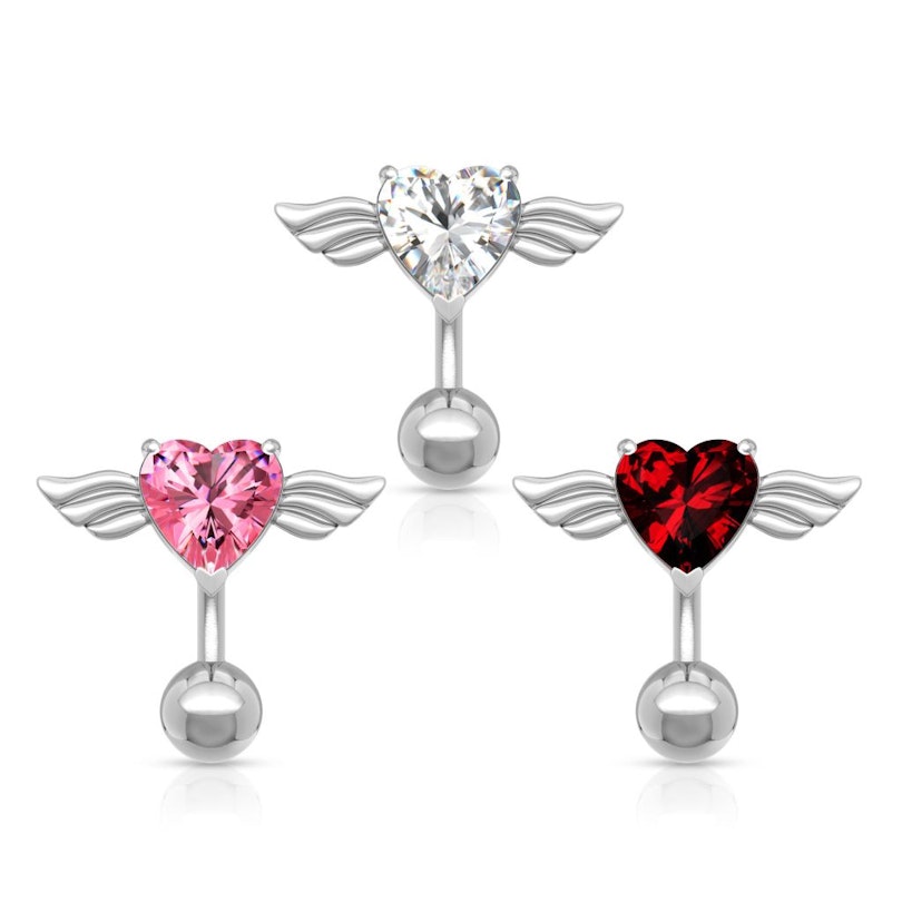 Nu kan du få det snygga motivet som många känner som ett av de mest populära tatueringsmotiv som navelpiercing. Det är det berömda lilla hjärtat med vingar på varje sida som det handlar om. Själva smycket är gjort av kirurgiskt stål som är det mest använda piercingsmyckematerialet eftersom det inte frisätter nickel. Hjärtat består av en snygg facetterad sten som du själv kan välja i en av de tre vackra färger.