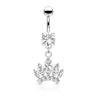 Navelpiercingen är gjord av kirurgiskt stål och har en blank massiv toppkula, medan bindkulan består av en stor snygg sten som matchar stenarna i den söta kronan i hänget. Du kan välja mellan två olika stenfärger, antingen klar eller rosa och den färg du väljer kommer att vara representerade i samtliga stenar i smycket.