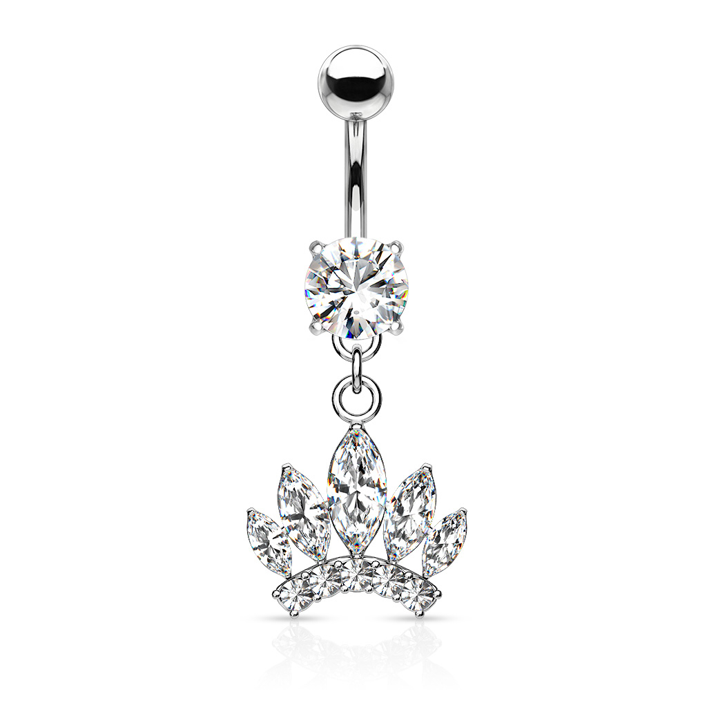 Navelpiercingen är gjord av kirurgiskt stål och har en blank massiv toppkula, medan bindkulan består av en stor snygg sten som matchar stenarna i den söta kronan i hänget. Du kan välja mellan två olika stenfärger, antingen klar eller rosa och den färg du väljer kommer att vara representerade i samtliga stenar i smycket.