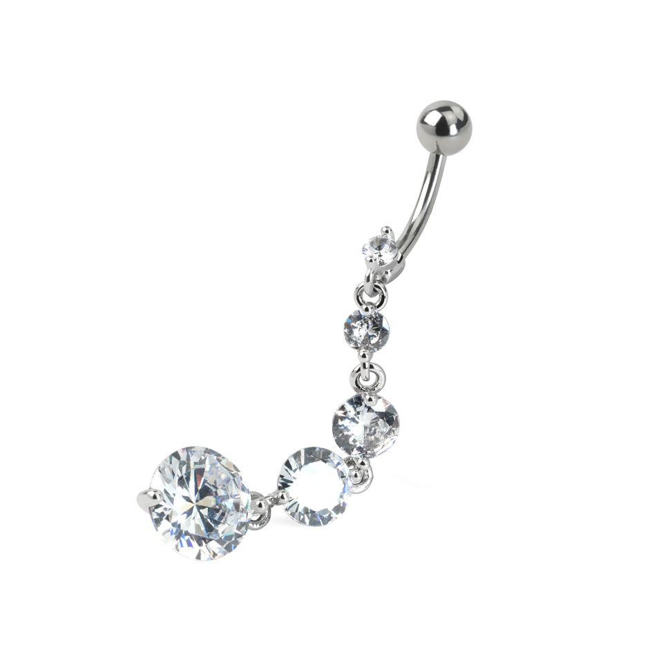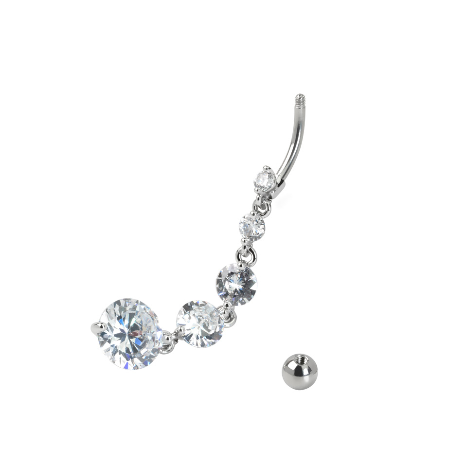 Navelpiercingens stav är 10 mm. lång och är gjort av det vanligaste smyckematerial, kirurgiskt stål. På toppen av staven sitter en helt vanlig toppkula. I botten av staven har vi det långa snygga hänge där du själv bestämmer färgen på stenarna.